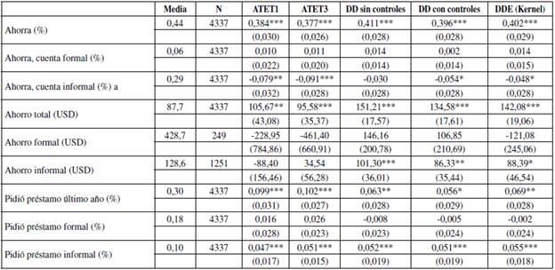 Cuando se analiza el stock de ahorro en las distintas alternativas, incluyendo el GACC, se observa un aumento significativo en el monto total reportado por los hogares del grupo de tratamiento (más de 100 ,SD). La magnitud del efecto es mucho mayor para los estimadores de los modelos de DD y DDE que para los de los modelos ATET con uno y tres vecinos cercanos, pero en todos los casos los coeficientes son positivos y estadísticamente significativos. Tal aumento puede atribuirse a incrementos en el monto ahorrado a través del GACC, porque cuando se separa el efecto en el stock de ahorro por tipo de alternativa de ahorro se encuentra un efecto nulo en el ahorro formal y un efecto positivo y estadísticamente significativo en el informal.