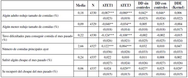 c. Seguridad alimentaria y capacidad de responder a choques inesperados. En la Tabla 7, se reportan los resultados de las estimaciones para variables de seguridad alimentaria, exposición a choques inesperados por parte del hogar y resolución de esos choques. Las primeras dos columnas (ATET1 y ATET3) muestran una reducción significativa en la frecuencia de episodios en los que algún adulto o menor del hogar debió reducir la cantidad de alimentos ingeridos por falta de dinero en los 30 días previos a la encuesta. El impacto de participar en un GACC disminuye la inseguridad alimentaria de los adultos en aproximadamente 8 y 4 %, para menores, cuando se utiliza el modelo de emparejamiento. Esta variable tiene en cuenta si algún miembro del hogar (adulto o menor) tuvo que reducir el tamaño de las comidas en el último mes. A pesar de este resultado, los estimadores de DD y DDE son positivos y estadísticamente significativos para los adultos, y positivos pero no estadísticamente significativos para los menores.