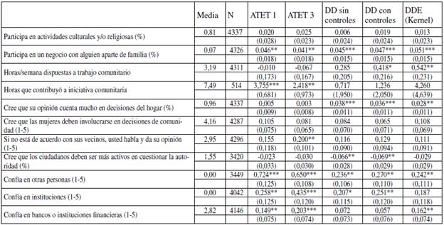 También se indagó por la participación de los individuos en iniciativas comunitarias. Para ello, se evaluó el número de horas en las que las personas estarían dispuestas a participar en una iniciativa comunitaria (de manera hipotética) y el número de horas que las personas realmente participaron en una de estas iniciativas, en caso de haberse presentado. En el primer caso, los estimadores de DD con controles y DDE muestran un aumento en la disposición de los tratados a participar en este tipo de iniciativas. Sin embargo, los tratados participaron al menos dos horas más (",2 desviaciones estándar más), apoyando la iniciativa comunitaria en relación con las horas que contribuyeron las personas del grupo de control, cuando se les presentó la oportunidad. Este resultado solo es válido con el modelo ATET1 y ATET311.
