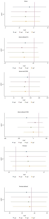 Las estimaciones de los modelos de emparejamiento evidencian un efecto positivo no estadísticamente significativo para el ahorro formal, lo que indica que los hogares tratados no usan mecanismos formales para guardar sus ahorros, con mayor frecuencia que los hogares del grupo de control. Por el contrario, se observa un efecto negativo y significativo en el porcentaje de hogares que ahorra en alternativas informales de ahorro como cadenas, compra de bienes durables y efectivo, entre otros. Este resultado podría indicar que los hogares vinculados a los GACC dejan de usar alternativas informales de ahorro, posiblemente, trasladando esos recursos hacia el GACC. Los coeficientes revelan una disminución en el uso de cuentas informales de entre 5 y 9 % en comparación con el grupo de control.