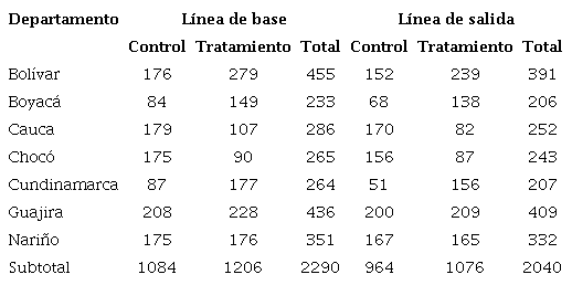 La Tabla 1 presenta la muestra del estudio por departamento, grupo de comparación y periodo de recolección de información. La línea de base cuenta con 2290 individuos de los cuales 1084 forman parte del grupo de control y 1206 del grupo de tratamiento. En la línea de salida se logró encuestar el 89 % del total de la muestra inicial; es decir, 2040 hogares, de los cuales 964 son controles y 1076 tratados3.