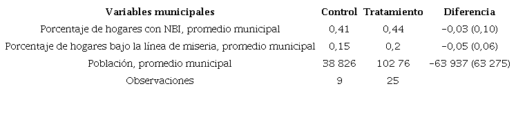 La Tabla 2 contrasta algunas características de los municipios del grupo de tratamiento y del grupo de control. Se observa que no hay diferencias estadísticamente significativas en los promedios de las variables analizadas. El promedio de hogares con NBI en los municipios de control es de 41 %, mientras que, en los tratados, es de 44 %.