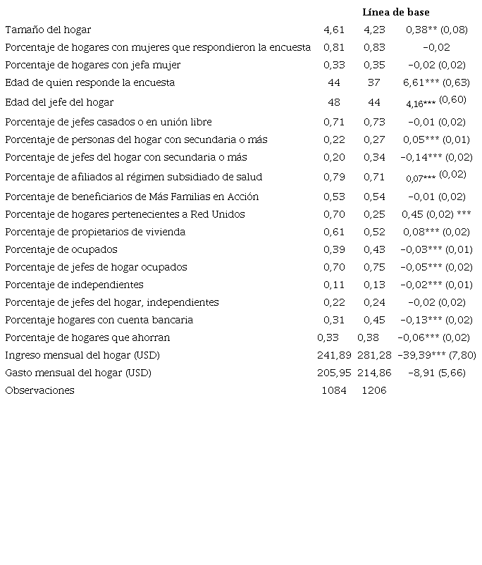 Finalmente, se observan diferencias estadísticamente significativas entre los valores reportados por los hogares de los grupos analizados en términos de ingresos. En promedio, una familia del grupo de control en la línea de base recibe el 86 % de lo que recibe una familia del grupo de tratamiento. La diferencia en los gastos del hogar entre los grupos es mucho menor y no es estadísticamente distinta de cero.