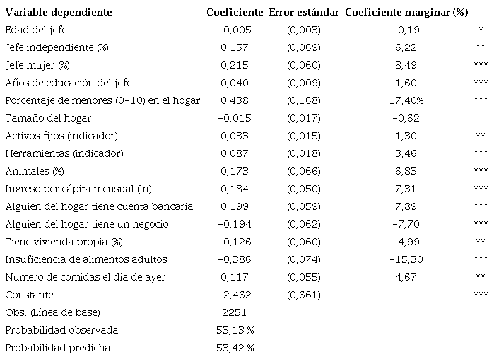 Antes de reportar los resultados de impactos, la Tabla 4 presenta los resultados de estimar la probabilidad de participar en un GACC, en función de las características observables del hogar (ecuación 1). Esta probabilidad está explicada de manera positiva por variables como las características del jefe de hogar (si tiene trabajo como independiente, el porcentaje de mujeres jefe, y el número de años de educación), el porcentaje de menores de diez años en el hogar, la tenencia de activos fijos, de herramientas y animales, el ingreso del hogar y el acceso al sistema financiero formal, a través de la tenencia de una cuenta bancaria. Otras variables como la edad del jefe de hogar, si alguien en el hogar tiene un negocio, si la vivienda es propia o si los adultos en el hogar tienen insuficiencia de alimentos, reducen la probabilidad de conformar un GACC.