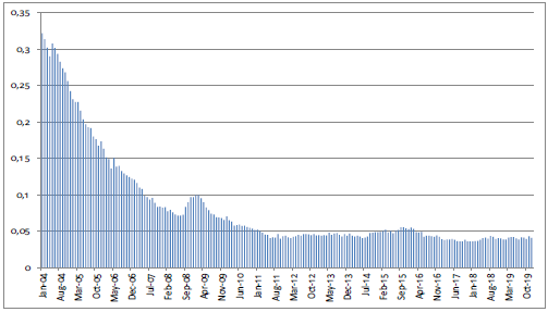 The reduction in the weight of foreign exchange-indexed securities in the total composition of government debt reflects the easing of external restrictions. Figure 1 shows this reduction in the share of exchange-indexed securities in the total public debt, especially between 2004 and 2011. After that, this share remained below 5% for most of the period. Considering the data analysed, we may conclude that, unlike the past, the last decades have been marked by important changes that have resulted in the fact that the Brazilian government does not incur in significant foreign currency debt and that the public debt is not indexed to the behaviour of the exchange rate.