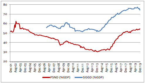 Jorge (2020) presents evidence that, in recent years, the Treasury did not suffer any kind of veto on the issue of its securities or undergo any persistent upward pressure on interest rates, managing to successfully hold its auctions. The 'bond vigilantes' argument does not hold up. Not even the downgrades in risk classification that the country experienced, with the loss of its rating as investment grade, were capable of creating pressures or persistent changes in the auction rates or in the quantity of bonds sold. Yet, neither has the increase in the domestic public debt (Figure 2) implied any major change in the Treasury's ability to conduct its debt-financing operations.