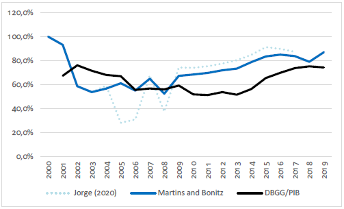 Figure 3, in turn, employs Jorge's (2020) methodology to evaluate the success of auctions. This indicator analyses the primary auctions of the National Treasury during the 2000s and compares the quantity of public securities sold in relation to the quantity offered by the Treasury. It is a proxy of market 'acceptance' of Treasury auctions and a measure of how 'easy' is to issue new debt by the Treasury. Figure 3 also plots the behaviour of indebtedness, in order to show that the increase in public debt in recent years did not jeopardise the Treasury's capacity to issue public securities.