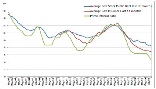 Our data suggests that there was no market rejection of bonds as a result of the increase in public debt, since the quantity of securities sold in relation to the total offered increased even with the increase in the stock of public debt as a proportion of the GDP as of 2014. Moreover, the volume sold during this period was higher than that registered between 2002 and 2013, when the debt/GDP ratio was in decline. Added to this is the fact that the average cost of debt did not increase proportionally to the increase in debt. The Treasury increased the quantity of new issues and the average cost followed the trajectory of the prime interest rate regardless of debt growth (Figure 4).