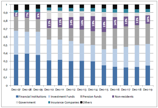 Another important feature is that the Brazilian public debt is mostly in the hands of domestic investors, notably financial institutions and institutional investors such as investment funds. In the past, financial liberalisation and the absence of capital controls allowed a large number of non-residents to enter the Brazilian markets, which could in fact increase the volatility of the foreign exchange rate and create certain vulnerability in the public bond market, should the Treasury be overly dependent upon these investors. However, as shown in Figure 5, the share of for eign investors that hold Brazilian public debt is relatively small and has been falling over the last few years -particularly after the country lost its international investment grade rating. The Treasury's capacity to place domestic public debt, therefore, does not depend directly on foreign 'bond vigilantes.'