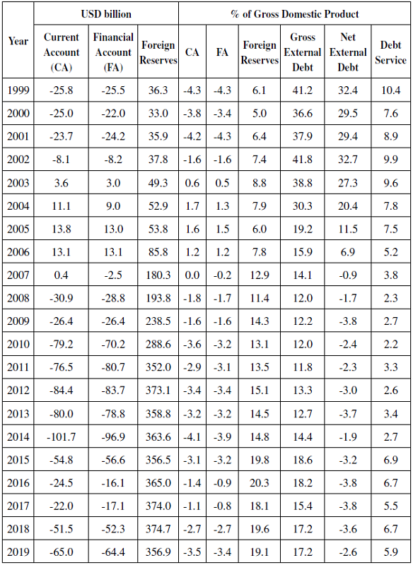 Table 1 shows a set of external indicators of the Brazilian economy. The current account balance, used in the literature as a basic measure of external constraint, showed positive values only between 2003 and 2007, before the international financial crisis, which indicates that Brazil still needs the inflow of foreign capital to obtain a surplus in the balance of payments. However, this does not necessarily mean that the Brazilian economy is continuously indebted in dollars.