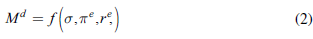 where aggregate money demand is defined to be a function of uncertainty (σ), expected inflation (πe)and the expected rate of return on investments and assets (re). While the first two are directly related to money demand (an increase in either implies an increase in demand), the third is inversely related.