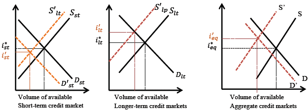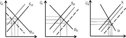 In static terms, an increase in money demand implies a contraction of the supply of loanable funds and a decrease in their demand in the short-term market. As the availability of an agent's liquidity begins to rise, their demand for short-term credit will tend to fall15. On the contrary, the long-term credit market will suffer the opposite effect: as the desired investment's term rises, there will be fewer incentives to finance it with cash balances. This explains why the reduced supply of loanable funds is not accompanied by an equal decrease in demand. In general, the share of long-term credit in aggregate credit will grow16. Figure 1 shows the aforementioned effect.