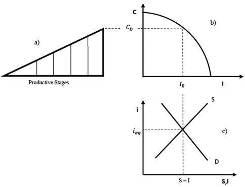 Figure 3 shows the graphical foundation of Garrison's analysis and presents an initial situation in which, gieen agents' time-preference, there is a productif structure ta) that is capable of satisfying present and future demand (represented as a possibility production frontier b)) and the market for loanable funds is in equilibrium at the natural interest rate (c).