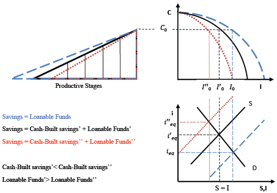 This concept allows the distinction between the two possible causes of excess supply in the example presented earlier. Should there be a variation in the amount of savings accompanied by a simultaneous variation in the amount of loanable funds in the same direction, the signal would be complete. Considering this reinforced signal, firms would begin to redirect their efforts towards more productive projects with longer maturities. On the contrary, if the variation in savings were not followed by a variation in loanable funds, a partial signal is given to the market and firms would not modify their productive processes. This analysis should also consider the production of goods and services while simultaneously including a dynamic conception of the saving process. An increase in savings does not only lead to a fall in output caused by the so-called derived-demand effect, but, if there is an equal increase in loanable funds supply, it is also followed by a time-discount effect improving the expected yield of new investments.