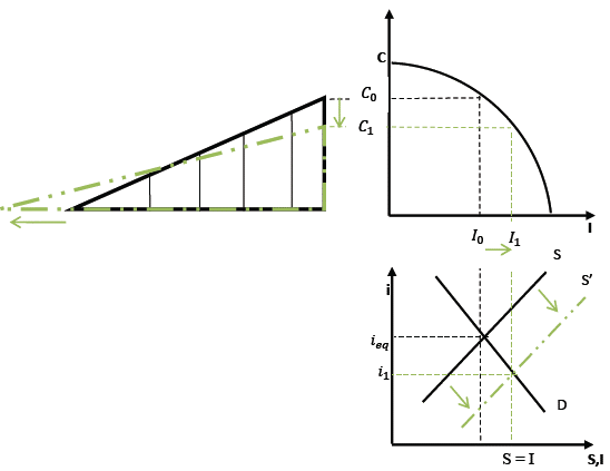 As in the initial equilibrium presented earlier, savings in the forni ofcash balances noticeably reduces the impact of an increase in saving's in loanable fund0 markets, which translates into a smaller reduction in the interest rates. The outcome is a lower yield for investments in capitel goods. This consequence was identified by Pätruti (2016) as a decrease in the potential growth rate.