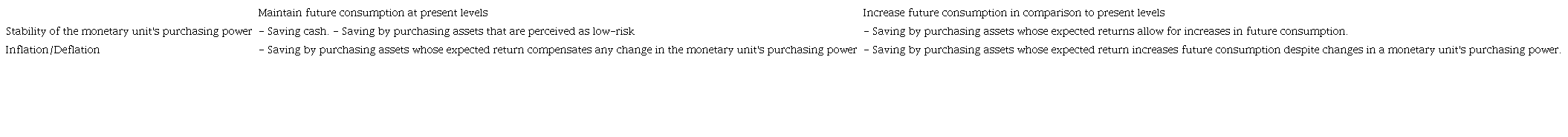 Following Garrison's definition of saving and its connection with investment, the decision of saving can be conceived as an individual's means to achieve their goals. Defining the goals pursued by the individual in terms of their future access to a given quantity of consumer goods, it is possible to analyse the various conceptions of this type of saving (See Table 1).