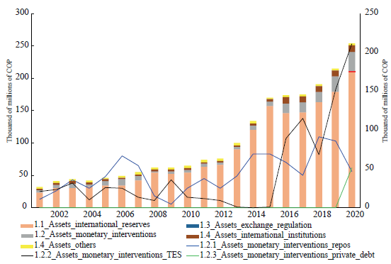 As Figure 1 and Figure 2 suggest, the Colombian CB has not engaged in an active role for financing the government directly, and only slightly indirectly. Figure 1 shows the assets of the CB: the left axis presents the total assets, in which it is clear that the majority of them are international reserves (clear orange), and that the monetary interventions (clear grey) are low; the right axis underscores the monetary interventions, in which the TES possession has increased in three moments: the 2009 financial crisis, the 2016 international commodities prices crisis, and the 2020 Covid crisis.