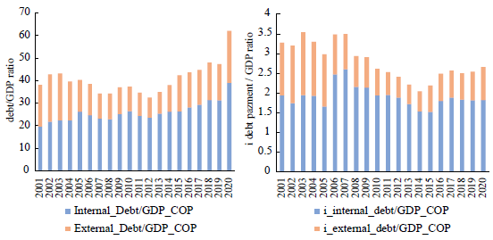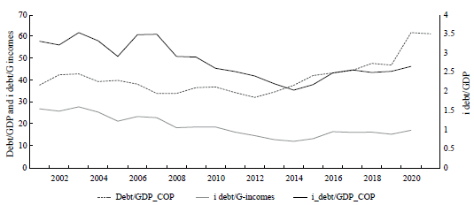 It is worth mentioning that compared to other similar Latin American countries, Colombia's public debt/GDP ratio is in an intermedium position: Argentina and Brazil have a debt/GDP ratio over 60%, Ecuador and Peru under 40%, while Colombia has oscillated between 40 and 50% in the last decades (CEPALSTAT, 2022). Latin American countries are somehow low if compared to developed countries. In the 2018 Japan had this ratio at 234%, U.S.A at 137%, United Kingdom at 116%, and Germany at 69% (OECD, 2022).
