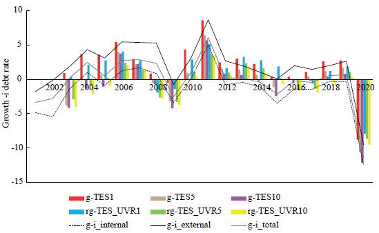 Figure 12 shows the difference between: the nominal growth rate and the consolidated interest rate of total public debt, internal public debt, and external public debt; the nominal growth rate and the interest rate of public bonds TES in COP for 1, 5 and 10 years; and the real growth rate and the interest rate of public bonds TES in UVR for 1, 5 and 10 years9. All variables follow, naturally, a similar path with oscillations that do not show any constant increasing or decreasing tendency over time. Throughout the years 2004-2008, 2010-2013 and 2018-2019 the interest rate on debt was, in general, below the growth rate of the economy -under this parameter, 15 years out of 20 the debt was sustainable. These are basically the same periods that were labeled as 'normal' in Figure 8 and Figure 9. If we consider that the interest rate on debt should have the discount of the tax rate, as correctly pointed out by Lavoie (2014), then this result improves because it will give extra space to the difference between growth rate and interest rate on debt.
