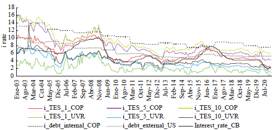 The first question is whether the Colombian government has any control over the interest rate of the debt. The influence of the Government on the interest rate of debt occurs through two economic mechanisms: the first one is by control of the short-term interest rate of the market that the CB has, and that influences all the other interest rates of the market, including the long-terms; the second one is by the fact that the CB can always buy the internal debt of the government, directly or indirectly, and so it could influence the market interest rates of bonds. Figure 13. shows the evolution of the interest rate of the target policy rate of the CB (that as shown in Figure 3 controls effectively the short-term interest rate of the market), the consolidated internal debt, the consolidated external debt, the TES in COP for 1, 5 and 10 years, and the TES in UVR for 1, 5 and 10 years. All variables seem to follow a similar path. In particular: (a) the interest rate of the Central Bank and the interest rate of the TES in COP of 1 year have practically the same movement; (b) the TES in COP of 5 and 10 years have a similar movement to the TES in COP of 1 year, but with a difference of 2-4 points in the interest rate; and (c) The TES in UVR also follows the movement of the TES in COP but with a lower interest rate, which is expected because they are attached to a real value -the difference can be seen as an inflation measure. All this suggests that the CB interest rate influences the debt rate10.