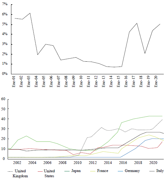 Figure 2 shows the amount of TES controlled by the Colombian CB and compares it with several developed countries. For the case of Colombia, the CB does not hold more than 6% of the total TES, while for the case of USA., France, Germany, and Italy it is approximately 20%, and in case of the United Kingdom and Japan it is around 35%. It is important to notice that the change in the pattern experienced after the 2008 crisis2 did not occur for the case of Colombia.