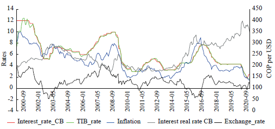 On the left axis Figure 3 presents the CB policy interest rate, the short-term interest rate of the market (TIB), the inflation rate and the real policy rate (the CB interest rate minus inflation); and on the right axis the exchange rate. Three movements can be observed: (a) first, how the CB has managed to attract the short-term interest rate of the market (TIB) to the policy target interest rate. (b) Second, how the real policy interest rate (the CB interest rate minus inflations) partially follows the inflation rate (which has a decreasing tendency), with the exception of the years 2002 and 2016 in which the movement is clearly the opposite. This behaviour is coherent with the one promoted by the orthodox view by means of Taylor's rule, and has been corroborated by the studies of Villa et al. (2014), and by Pabón and Bedoya (2016). And (c) third, the exchange rate, represented in the secondary axis, has a similar movement to the inflation rate. In this sense, there seems to be a movement that goes from the exchange rate to inflation, from inflation to the CB target interest rate, and from the CB interest rate to the short-term rate of the market.