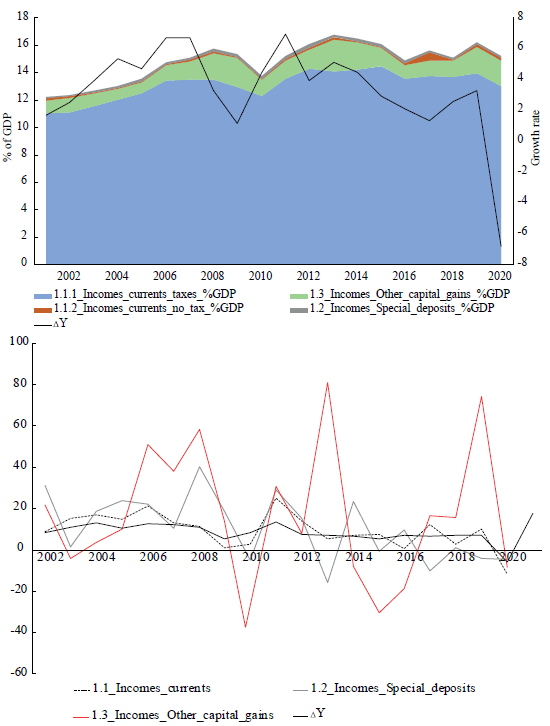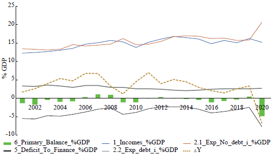 Figure 4 shows the CG incomes, expenditures, primary balance, final deficit, and interest debt payment for the period 2001-2020.