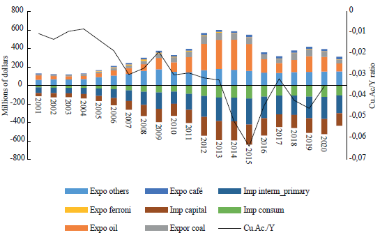 For the case of Colombia, its productive structure is highly dependent on imports of capital goods and intermediary goods -see Figure 7. Exports are dominated by oil and coal, whose price and demand depends on international factors, and not on the neoclassical presupposition that a depreciation of the currency will increase the demand of export products. The right axis of Figure 7 shows the ratio of the current account with the GDP, that presents a negative and constant decreasing behaviour over time.