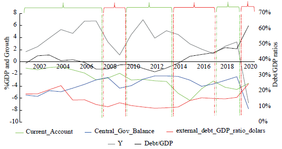To understand the movements of the variables in Figure 8 and Figure 9. It is useful to divide and contextualise them in time. The periods in green (2001-2007; 2010-2013; and 2018-2019) are the 'normal' times in which most of the macroeconomic indicators are having a positive tendency. The periods in red represent economic crises (2008 -2009; 2014-2017; and 2020).
