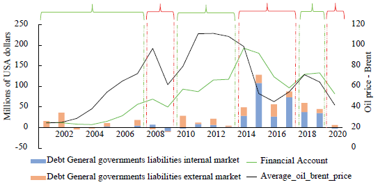 On the left axis Figure 8 presents the deficit of the CG and the current account deficit as percentages of GDP, and the growth rate of the economy. The right axis shows the evolution of the total debt/GDP ratio and the external debt in the USA. The U.S. dollars/GDP ratio -the external ratio is important to compare the external debt movement with the general debt movement. To complement this information, on the left axis Figure 9. shows the financial account of the balance of payment and the liabilities of debt contracted by the general government internally and externally, which is part of the financial account, and on the right axis the international price of oil.