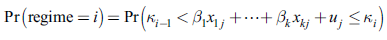 for the i-th regime, with the linear model plus a normal error defining the probability of being between two cut points given by к0, к1 ,...,кк-1, where k is the number of regimes and parameters are estimated as the β coefficients (Cameron and Trivedi, 2005). The generalised method instead estimates a different set of β coefficients for each interval defined by the kk thresholds.