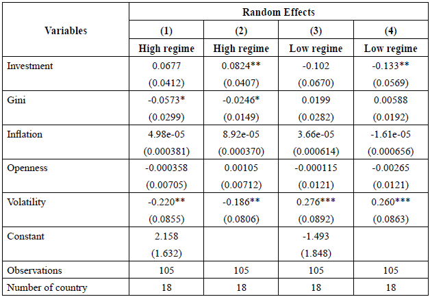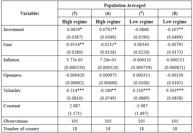 In short, the results found here seem to indicate that in order to achieve regimes of high economic growth it is necessary to apply policies that reduce income inequality in order to avoid social unrest, as well as anticyclical policies in order to minimise the amplitude of economic cycles. Based on the evidence obtained in this study, both positions should favour investment and growth.