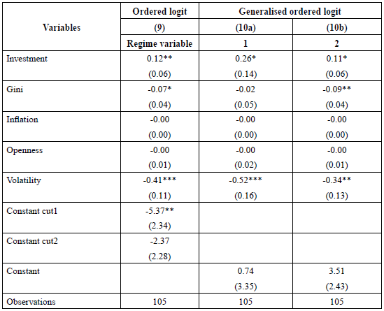 On the other hand, the generalised ordered Logit gives additional insights to the previous results. The effects of output growth rate volatility are more significant when the economy is moving from low to intermediate growth regimes, than when it transits from intermediate to high ones, which implies that, as put forth by Ber-múdez et al. (2015), higher economic volatility reduces the probability of accessing the high economic growth regime, as mentioned previously. Finally, inequality only negatively affects the probability of being in a high growth state, in accord with the results obtained by Malinen (2013), Ncube (2014), Kotlánová (2015), among others.