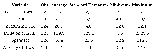 We apply a panel data approach for 18 Latin American countries for the 19802014 period. The list of countries consists of Argentina, Bolivia, Brazil, Chile, Colombia, Costa Rica, Dominican Republic, Ecuador, El Salvador, Guatemala, Honduras, Mexico, Nicaragua, Panama, Paraguay, Peru, Uruguay and Venezuela. The source of our variables is the World Bank, except for the inflation rate, which was extracted from CEPAL. All variables are measured as quinquennial averages. Some basic descriptive statistics are shown on Table 1.