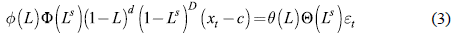 Donde xt es la variable del mercado laboral en análisis; c es el vector de componentes determinísticos (constante, tendencia, etc.); εt es el residuo con media cero y varianza σ2 (ruido blanco); L es el operador de rezagos (Lxt= xt-1); s es la periodicidad del componente estacional; ф(L ) y Ф (Ls) son los operadores autorregresivos no estacional y estacional; θ(L) y Θ y (Ls) son los operadores de media móvil no estacional y estacional; (l - L)d y (l - Ls )D - son los operadores de diferenciación del componente autorregresivo y estacional.