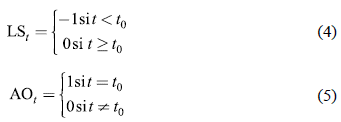 En el vector c se incluyen variables dummies para detectar cambios de nivel (level shifts, LS) y datos atípicos aditivos (aditive outliers, AO). Estas variables se construyen así: