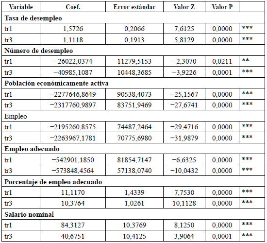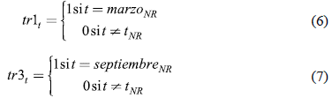 Donde tr 1t y tr3t son las variables dummies para los meses de marzo y septiembre en el periodo muestral que no tiene representatividad nacional (NR) (2007-2013). Se estima el modelo de la ecuación (3) incluyendo las variables dummies de outliersy de no representatividad (tr1t y tr3t) con el método de máxima verosimilitud. Además, se emplean los criterios de información y las funciones de autocorrelación y correlación parcial para determinar el número de rezagos autorregresivos, de media móvil y de diferenciación.