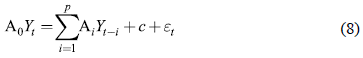 Donde yt es el vector de variables endógenas (crecimiento del PIB y desempleo); A. es la matriz de parámetros estructurales en el rezago j = 0,..., p.; es el vector de variables determinísticas incluidas en el modelo (como la constante y las dummies para controlar datos atípicos, como la crisis financiera internacional de 2008 y el colapso del precio del petróleo en el último trimestre de 2014); y et es el vector de choques estructurales (demanda y oferta agregadas) con distribución normal N(0,1).