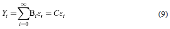 Una de las principales dificultades que plantea un modelo SVAR es la identificación de los choques estructurales. Sin dicha identificación, el vector εt de la ecuación (8) sería un vector de residuos estadísticos correlacionados que no tendrían una interpretación económica (Rubio-Ramírez et al., 2010). El modelo base desarrollado usa el enfoque de Blanchard y Quah (1989) para identificar las relaciones de largo plazo de las variables incluidas en el modelo con los choques de demanda y oferta. Los autores indican que, en un modelo con variables estacionarias, la ecuación (8) se puede expresar con la representación de la media móvil así:
