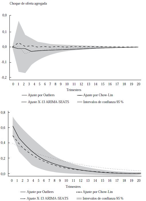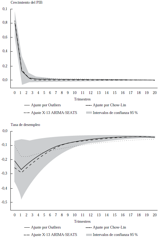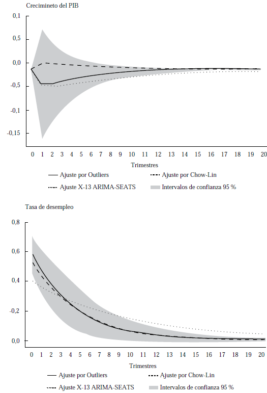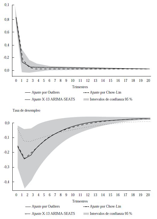Una diferencia particular de la estimación de punto se observa en la respuesta del desempleo ante el choque de demanda agregada. En el modelo bivariado, se obtiene un efecto mayor con la metodología de Chow-Lin, mientras que la magnitud de la respuesta del desempleo ante cambios inesperados de la demanda es mayor con el ajuste de outliers identificados. Esta diferencia solamente se presenta en la estimación de punto, pues las estimaciones de los dos métodos son estadísticamente iguales.