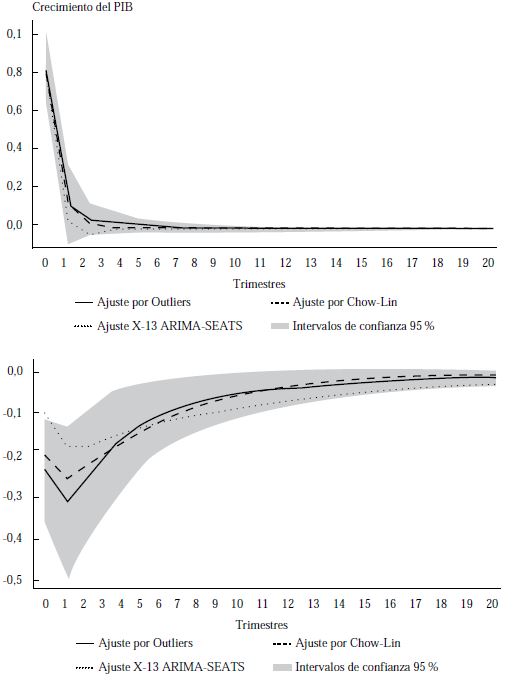Al analizar el choque de oferta, en la Figura 3 se observa que no existe un efecto en el crecimiento del PIB, tanto con el ajuste por outliers identificados como con los otros métodos, pues los intervalos de confianza contienen el cero.