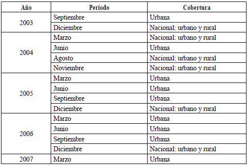El levantamiento de datos relacionados con el mercado laboral se inició en el año 1985, con la creación del Instituto Nacional de Empleo (INEM), adscrito al Ministerio de Trabajo. En noviembre de 1987, se dio el primer levantamiento de información de la Encuesta Permanente de Empleo y Desempleo, la cual tuvo representatividad urbana y periodicidad anual (véase INEC, 2011). A partir de 1993, la ENEMDU fue realizada por el Instituto Nacional de Estadística y Censos y financiada por el Banco Central del Ecuador (BCE). La representatividad de esta encuesta fue urbana y, hasta 2002, se desarrolló de manera anual. A partir de septiembre de 2003, se implementó la ENEMDU de manera trimestral. Desde esa fecha, hasta el año 2013, se utilizó como marco muestral el VI Censo de Población y el V de Vivienda (CPV) de 2001 (INEC, 2011). En la Tabla 1, se detalla la periodicidad y la desagregación de la ENEMDU desde el 2003 hasta el 2007.