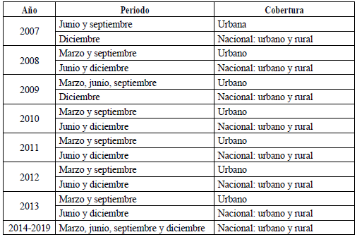 Como ya se mencionó (Tabla 2), la ENEMDU no tiene representatividad nacional en los meses de marzo y septiembre entre 2007 y 2013; mientras que, para el resto del periodo muestral, sí tiene representatividad.