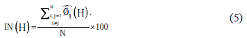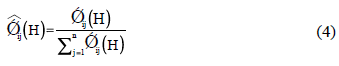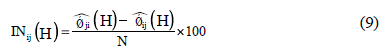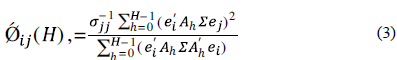 De esta manera, en la medida que los choques de las variables no se ortogonalizan, las sumas de las contribuciones a la varianza del error de pronóstico no necesariamente son iguales a 1. Así, la participación de varianza propia se define como una fracción H de la variación del error en la predicción x, lo que está relacionado con el choque de otra variable j en el sistema. De manera que i, j = 1, 2, 3.....N; tal que i ≠ j .