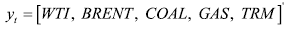 La Tabla 4 muestra las relaciones de cointegración del modelo. De este modo, se realiza la prueba de cointegración de las variables, que resumen los casos en que es posible aplicar la prueba de cointegración de Johansen. Estos son sin intercepto ni tendencia y con intercepto, ni tendencia. Además, la prueba ofrece el criterio de la traza y el criterio del máximo valor propio. Los resultados arrojan, según el caso y el criterio, entre 2 y 3 relaciones de cointegración, lo que permite inferir que las variables están cointegradas, es decir, que las series comparten una tendencia esto-cástica común. Es importante anotar que, la relación de cointegración más evidente se presenta entre los precios del petróleo WTI y Brent, pero, aun así, siguen existiendo más relaciones de cointegración en el modelo.