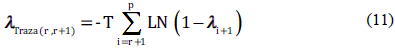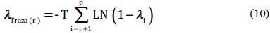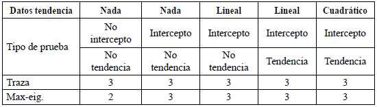 Dado su comportamiento, las variables utilizadas pueden tener relaciones de equilibrio a largo plazo, ya que el sistema de ecuaciones presenta combinaciones lineales que generan vectores de cointegración, lo que ocasiona que la desviación del equilibrio entre las variables afecte el corto plazo. En ese sentido, las combinaciones lineales de variables no estacionarias y cointegradas generan residuales estacionarios (Engle y Granger, 1987; Johansen, 1991). Para resolver este problema Johansen (1988; 1991) desarrolló una prueba para determinar el número de relaciones de cointegración. Por tanto, se define la hipótesis nula de la presencia de relaciones de cointegración en discrepancia de k relaciones de cointegración. Donde k representa el número de variables endógenas exteriorizando un modelo VAR con variables de orden I(1), donde el modelo arroja residuales estacionarios. Las primeras hipótesis indicadas se contrastan con el estadístico de la traza, descrito a partir de la siguiente ecuación: