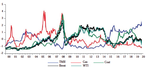 En la Figura 1 puede observarse el comportamiento de las series de interés en su versión normalizada. Inicialmente, se aprecia que los precios de estas materias primas, en la primera mitad de la década del 2000 hasta 2008, presentaron un aumento significativo. De forma contraria, la tasa de cambio colombiana tuvo un comportamiento inverso en la mayoría de los periodos. Después de la crisis subprime, a diferencia del carbón y el petróleo, el gas tuvo un cambio estructural y siguió otra senda de comportamiento.
