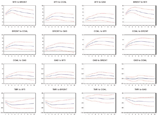 En este sentido, dado que Sims et al. (1990) mencionaron que es posible utilizar un modelo VAR con las variables en niveles, siempre que las series estén cointegradas, se estima un modelo VAR generalizado y cointegrado2. En la Figura 2, se observan las funciones impulso-respuesta (FIR) del modelo estimado, a dos desviaciones estándar. Los resultados permiten evidenciar que los precios de las materias primas seleccionadas responden de manera significativa y positiva ante un choque positivo del precio de cualquier commodity, exceptuando la respuesta del gas frente al carbón, dado que no se presenta significancia estadística.