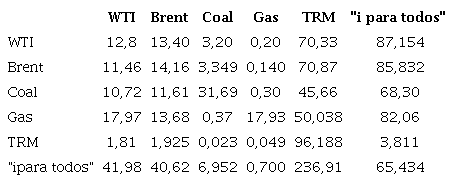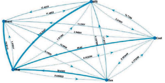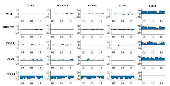 Por su parte, el mercado que recibe el choque se muestra en las columnas, mientras que el mercado que lo trasmite se muestra en las filas. Por tanto, puede observarse que las variaciones de los precios del petróleo pueden explicar en 70 % la volatilidad direccional de la tasa de cambio, mientras que las fluctuaciones de los precios del gas pueden explicarla hasta en 50 % y los precios del carbón lo hacen en 45 %.