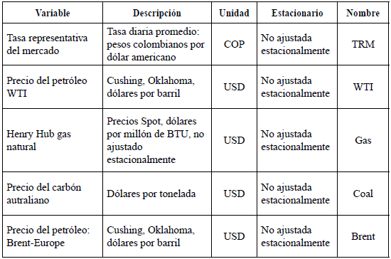 Los datos utilizados, que presentan una frecuencia mensual, están definidos por un periodo de muestra entre enero de 2000 y abril de 2020. La selección de variables se basa en autores como Oviedo-Gómez y Sierra (2019) y Oviedo-Gómez y Candelo-Viáfara (2020), quienes encontraron una relación entre el tipo de cambio colombiano y los precios de las materias primas. Las variables de interés, descritas en la Tabla 1, se definen como la tasa de cambio pesos-dólar, el precio del barril de petróleo WTI, el precio del petróleo Brent, el precio Spot del gas natural Henry Hub y el precio del carbón australiano. Todos estos datos se obtuvieron de la base de Datos del Banco de la Reserva Federal de ST. Louis.